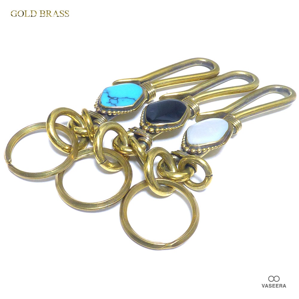 ゴールドブラス(真鍮) 100mm 天然石三種 装飾プレート ベルトフック 30mm二重カン付きキーホルダー 【キーリング 】