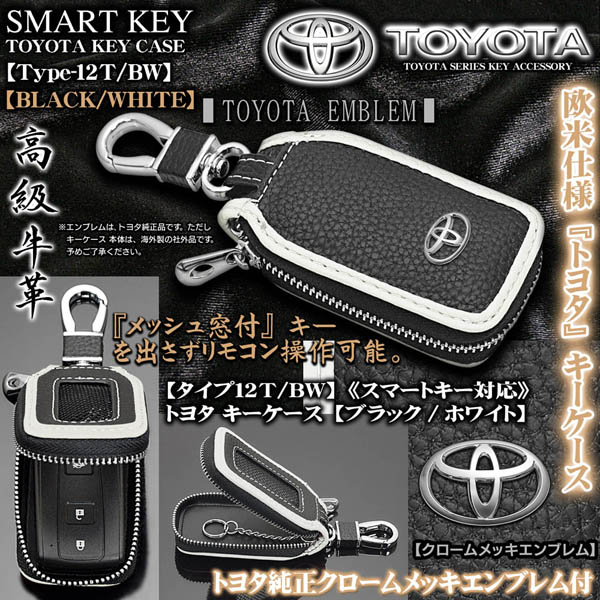 【タイプ12T/BW】トヨタキーケース《ブラック/ホワイト》 トヨタメッキエンブレム/キーホルダー/窓付/スマートキー対応/牛革製...