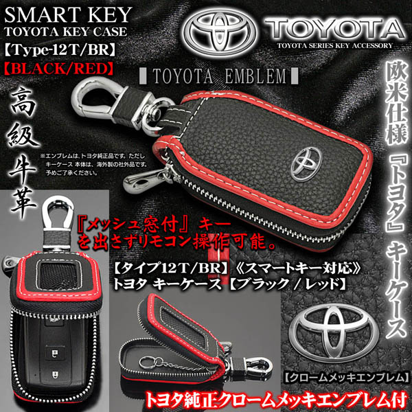 【タイプ12T/BR】トヨタキーケース《ブラック/レッド》 トヨタメッキエンブレム/キーホルダー/窓付/スマートキー対応/牛革製/...