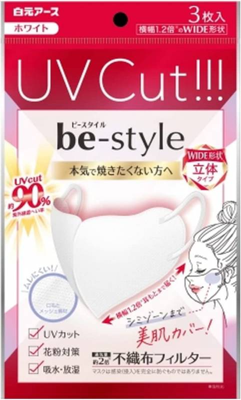 マスク 不織布 ビースタイル UVカットマスク ホワイト3枚入【ネコポス】 送料無料 白元アース 小顔 女性用 紫外線対策 夏用マ...