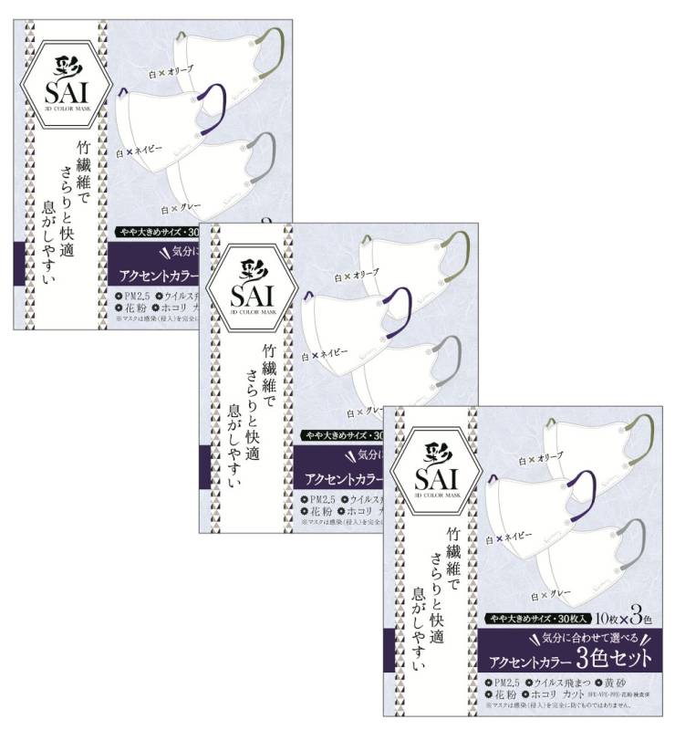 彩 saiマスク立体 不織布 バイカラーマスク アクセントカラーやや大きめサイズ 30枚×3【3個セット】送料無料 おしゃれマスク...