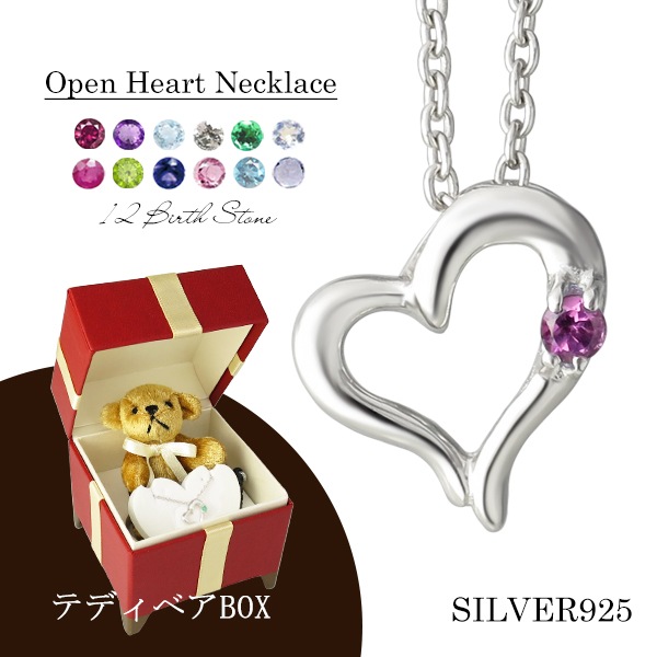 選べる 誕生石 オープンハート ネックレス テディベア ギフトBOX プラチナコート シルバー925 シンプル 華奢 一粒 小さめ...