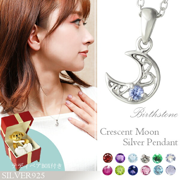 選べる 誕生石 三日月 ネックレス テディベア ギフトBOX プラチナコート シルバー925 アラベスク 華奢 一粒 小さめ シル...