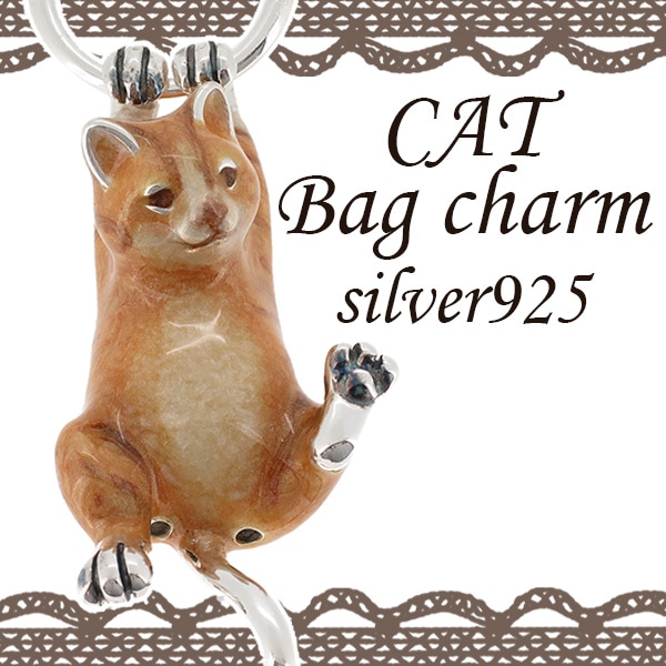 ★ 送料無料 ★ぶら下がり 猫の シルバーバッグチャーム