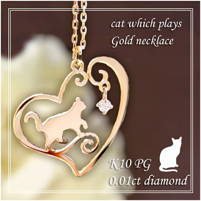 K10 PG ダイヤモンド じゃれる 猫 オープンハート ネックレス 10金 10k k10 ピンク ゴールド レディース 女性用...