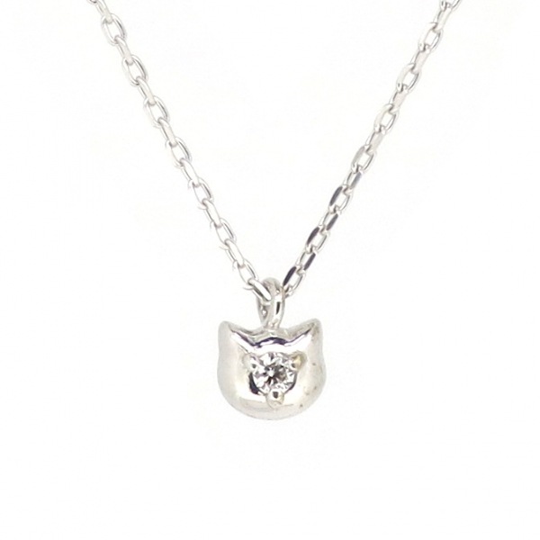 猫 ゴールドネックレス(チェーン付きペンダント) ねこ キャット 粒 ストーン 18金 ホワイトゴールド ダイヤモンド ダイアモン...