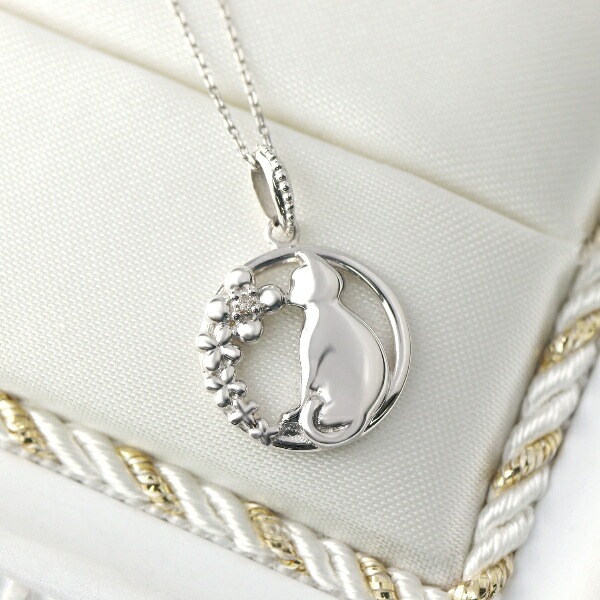 猫 と 花 ダイヤモンド ホワイトゴールド ネックレス ねこ フラワー K10 ゴールド 10金 10k かわいい 猫ネックレス ...