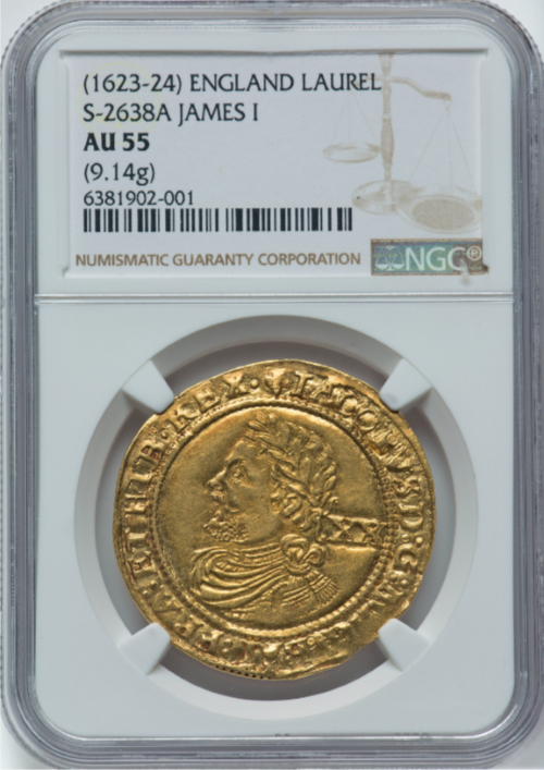 【動画あり】アンティークコイン グレートブリテン 1623-24年 ジェームズ1世 ゴールド・ローレル金貨 NGC-AU55
