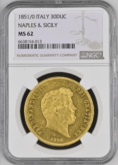 【動画あり】【レア度2-R2】イタリア 1851/0年 フェルディナンド2世 30ドゥカティ金貨 NGC-MS62