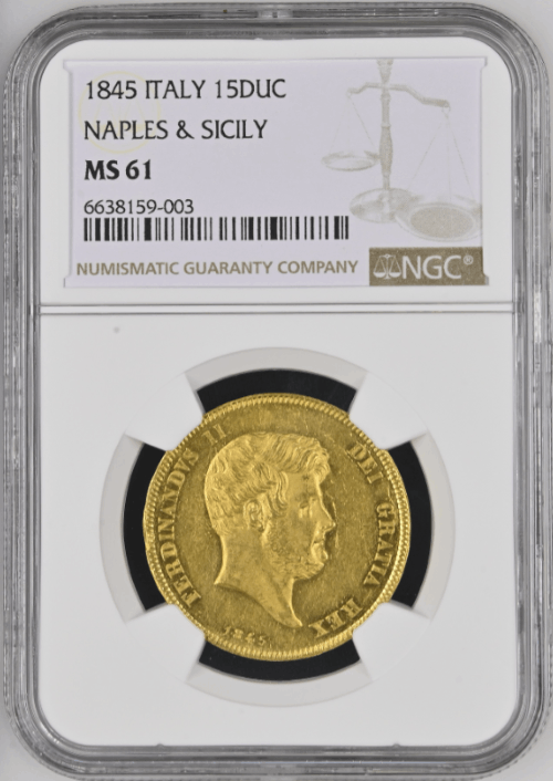 【動画あり】【レア度2-R2】イタリア 1845年 フェルディナンド2世 15ドゥカティ金貨 NGC-MS61