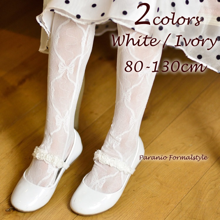 送料無料/ レース タイツ リボン柄 女の子 ホワイト アイボリー ブラック 80-135cm