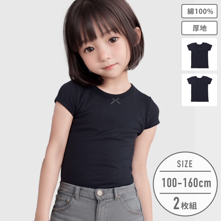 【女の子】キッズジュニア半袖(3分袖) 2枚組 黒無地/リボン付き 100~160m【綿100%/厚地】