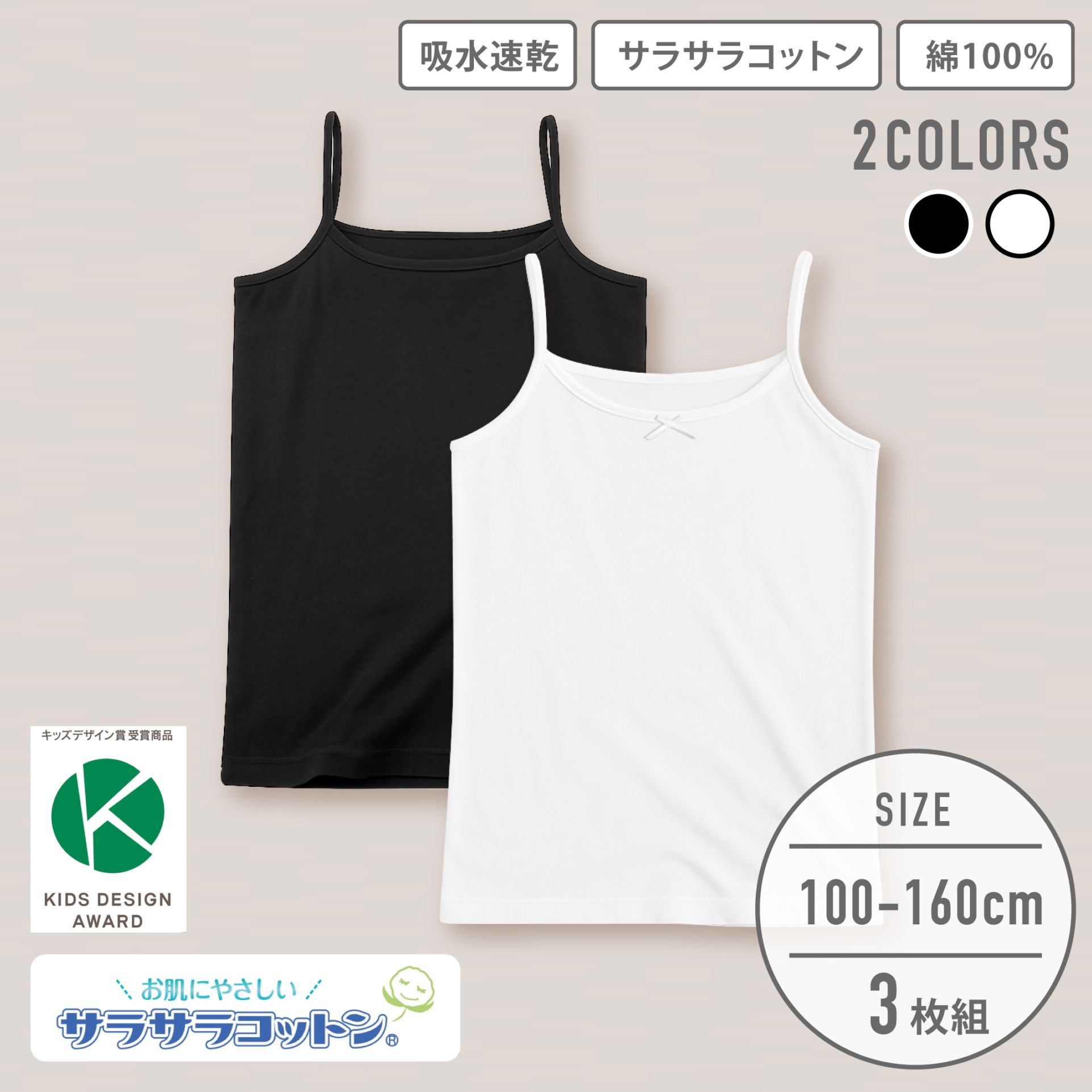 販売数60万セット突破!【女の子】キッズジュニアキャミソール 3枚組 サラサラコットン 100~160cm 【綿100%/吸水速乾...