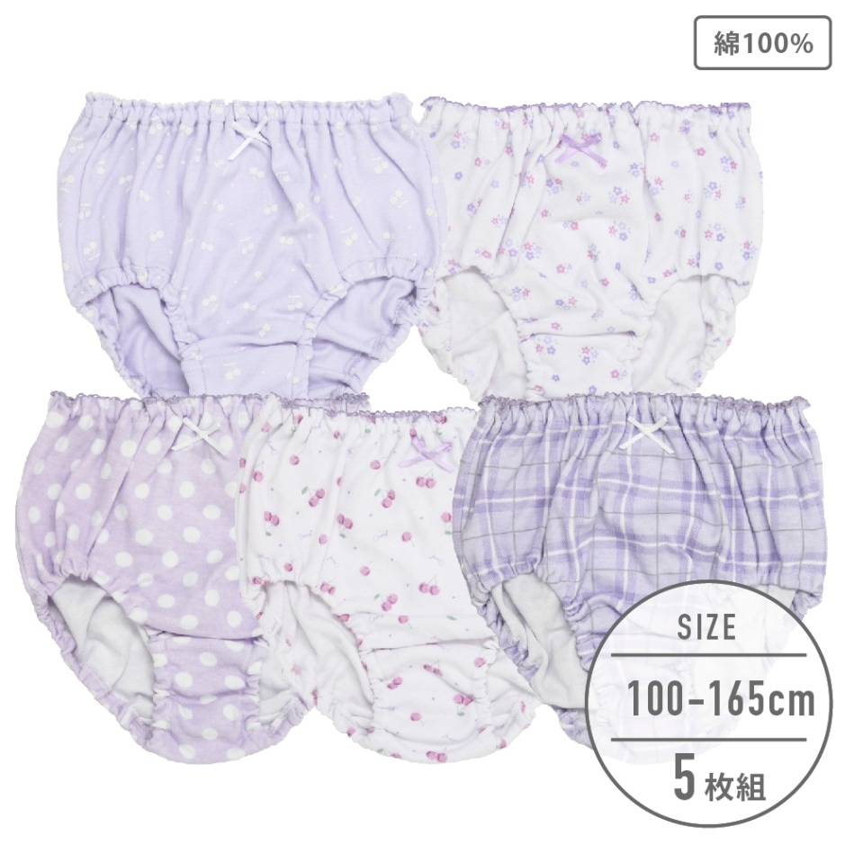 【女の子】キッズジュニアショーツ 5枚組 パープル総柄 100~165cm【綿100%】