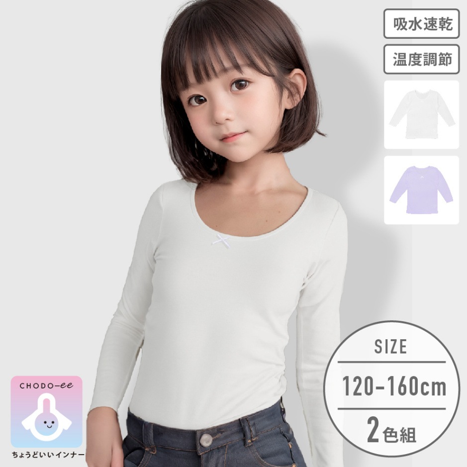 【女の子】キッズジュニア長袖(8分袖) 2枚組 無地/リボン付き 120~160m【温度調節/吸水速乾】