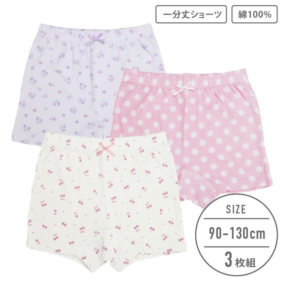 【女の子】キッズ一分丈ボクサーショーツ 3枚組 チェリー/ドット/フラワー 90~130cm【綿100%】