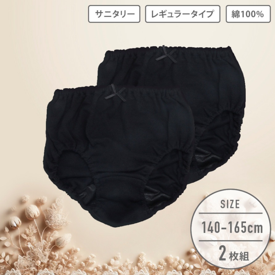 【女の子】ジュニアサニタリーショーツ 2枚組 黒無地/リボン 140~165cm【レギュラータイプ】