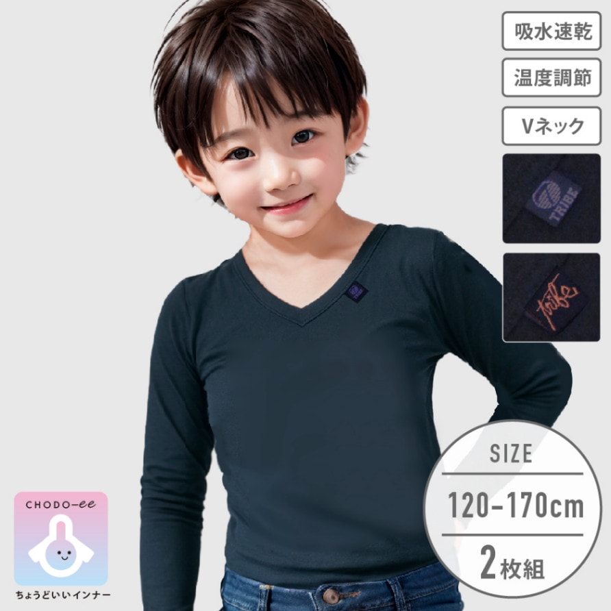 【男の子】キッズジュニア長袖 V首 2枚組 無地 120~170cm【温度調節/吸水速乾】