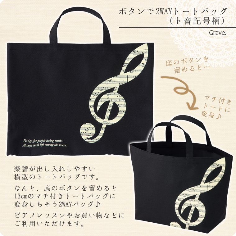 ボタンで2WAYトートバッグ(ト音記号柄)[グラーヴェ]【レッスンバッグ・音楽バッグ】【有料名入れ可】