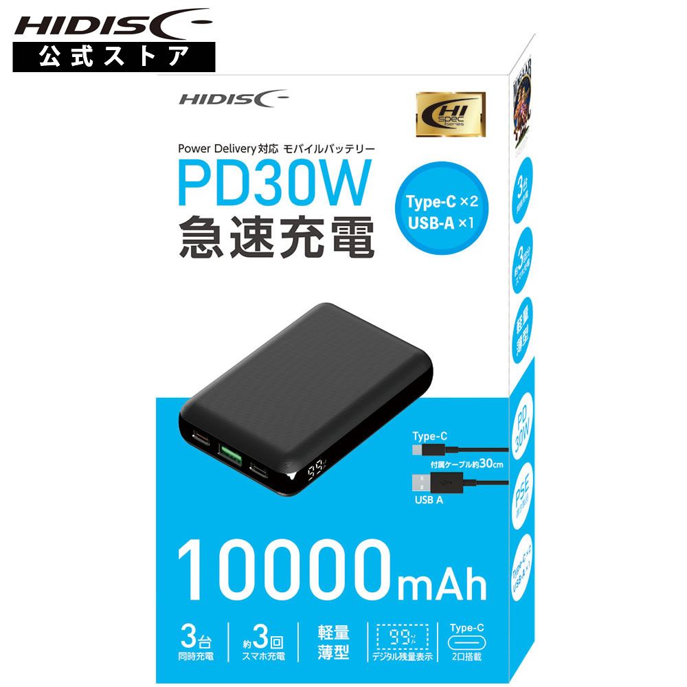 HIDISC PD30W急速充電 Type-Cx2, USB-Ax1 モバイルバッテリー 10000mAh HD-PD30W100...