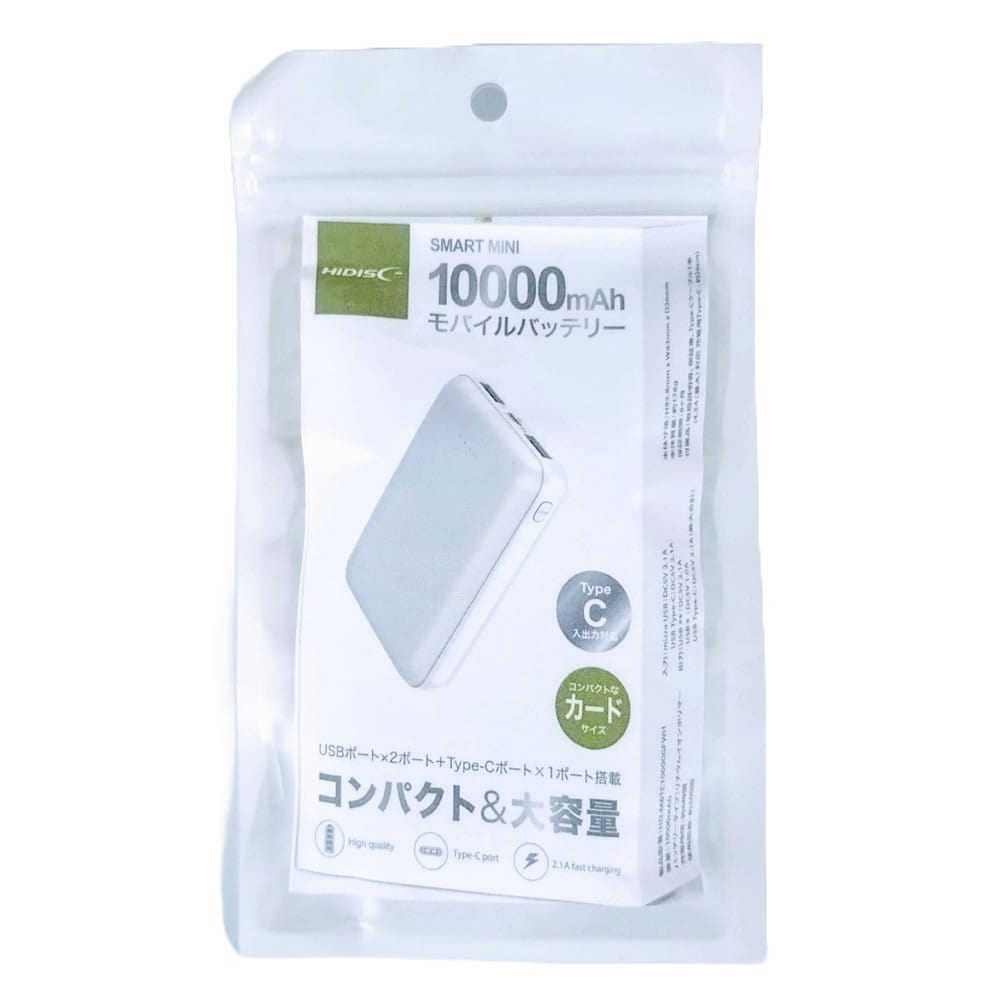 HIDISC 世界最小クラス 急速充電モバイルバッテリー 10000mAh ホワイト HD4-MBTC10000WHP