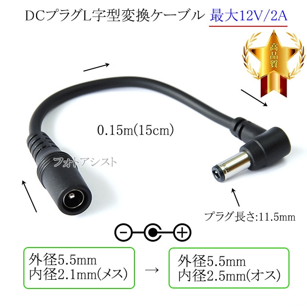 DCプラグL字型変換ケーブル 外径5.5mm/内径2.1mm(メス)→外径5.5mm/内径1.7mm(オス) 最大12V/2A...