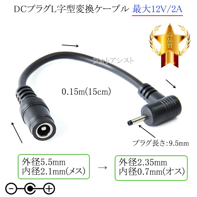 DCプラグL字型変換ケーブル 外径5.5mm/内径2.1mm(メス)→外径2.35mm/内径0.7mm(オス) 最大12V/2...