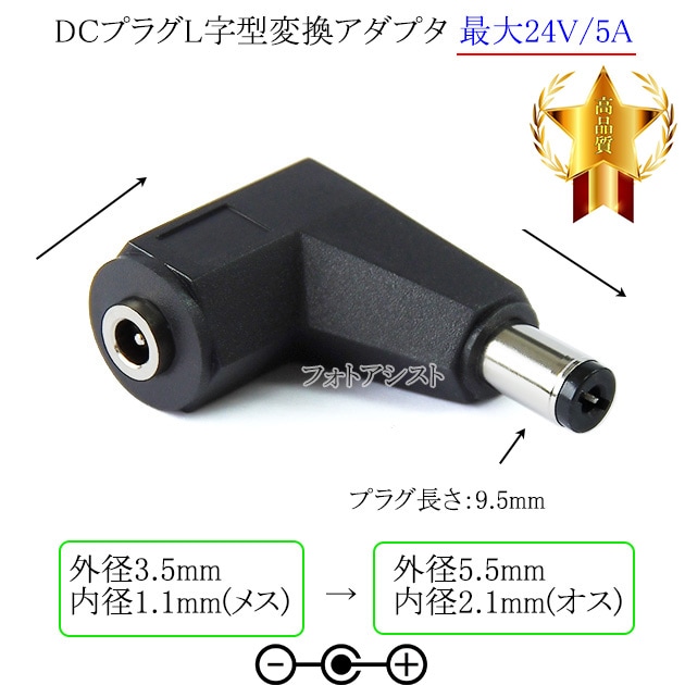DCプラグL字型変換アダプタ 外径3.5mm/内径1.1mm(メス)→外径5.5mm/内径2.1mm(オス) 最大24V/5A