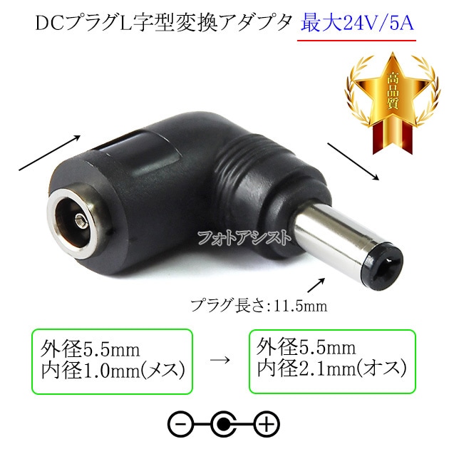 DCプラグL字型変換アダプタ 外径5.5mm/内径1.0mm(メス)→外径5.5mm/内径2.1mm(オス) 最大24V/5A