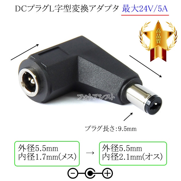 DCプラグL字型変換アダプタ 外径5.5mm/内径2.1mm(メス)→外径5.5mm/内径1.7mm(オス) 最大24V/5A
