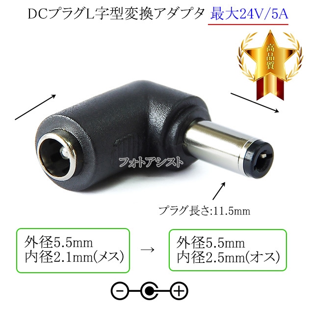 DCプラグL字型変換アダプタ 外径5.5mm/内径2.1mm(メス)→外径5.5mm/内径2.5mm(オス) 最大24V/5A