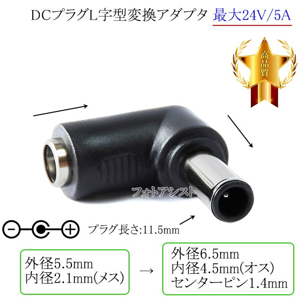 DCプラグL字型変換アダプタ 外径5.5mm/内径2.1mm(メス)→外径6.5mm/内径4.5mm(オス) センターピン1.4...