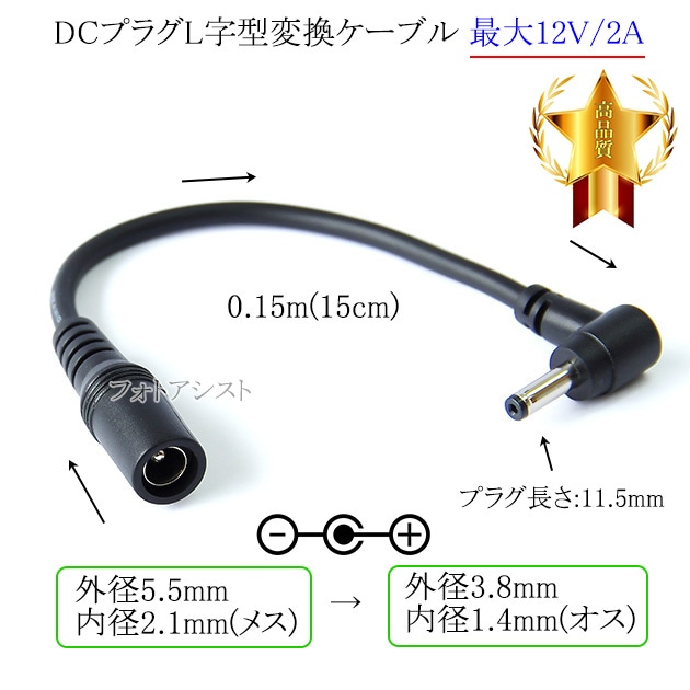 DCプラグL字型変換ケーブル 外径5.5mm/内径2.1mm(メス)→外径3.8mm/内径1.4mm(オス) 最大12V/2A...