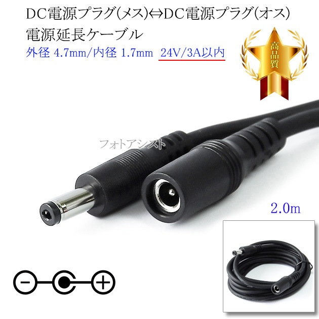 DC電源プラグ⇔DC電源プラグ 電源供給ケーブル 外径 4.7mm/内径 1.7mm 12V/2A以内 長さ2.0m ブラッ...