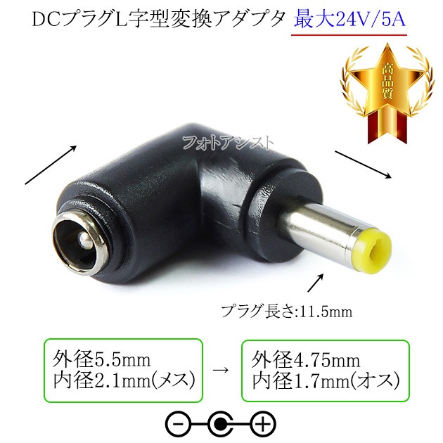 DCプラグL字型変換アダプタ 外径5.5mm/内径2.1mm(メス)→外径4.75mm/内径1.7mm(オス) 最大24V/5...
