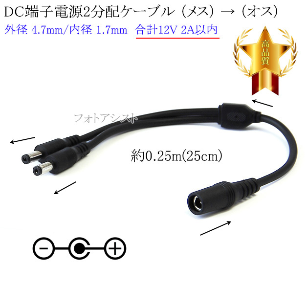 DC端子電源2分配ケーブル 外径 4.7mm/内径 1.7mm 合計12V 2A以内 長さ0.25m (25cm) ブラック
