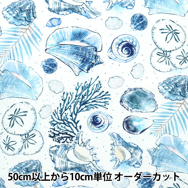 【数量5から】 生地 『USAコットン オーシャン・ブルー・シェル・トレジャース ホワイト THOMAS-CD1303』