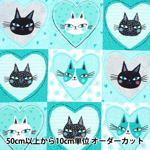 【数量5から】 生地 『USAコットン キャッツ&ハーツ ターコイズ 13163-81』