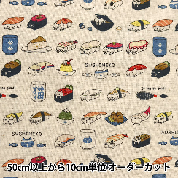【数量5から】 生地 『綿麻キャンバス 寿司ネコ サックス KTS6601-A』 COTTON KOBAYASHI コットンこばや...