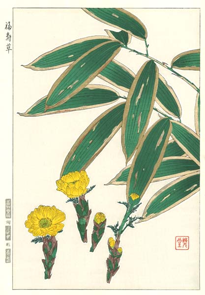 F014 福寿草と笹 花版画 Flower Woodcut ‐Adonis‐
