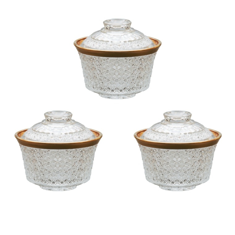 ガラス 茶道具 義山 菊籠目蓋物 縁金 3客組 長寿作 大きさ:直径11.5x高さ10cm
