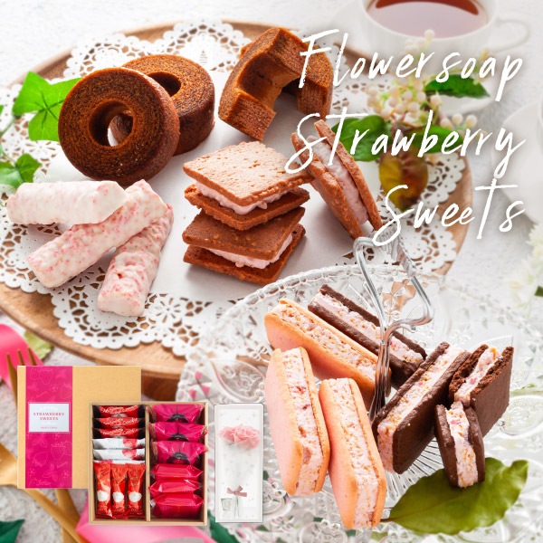 フラワーソープブーケとあまおう苺スイーツ5種アソート | 誕生日 お礼 プレゼント スイーツ ギフト 焼き菓子 内祝 贈答用 送料...