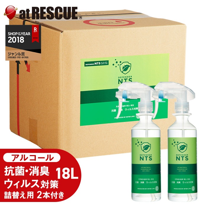 【様々な菌の抑制効果確認】ディフェンダーNTS 18L アルコール【300ml詰替用の空きボトル2本付】【抗菌消臭剤】【取寄せ品】