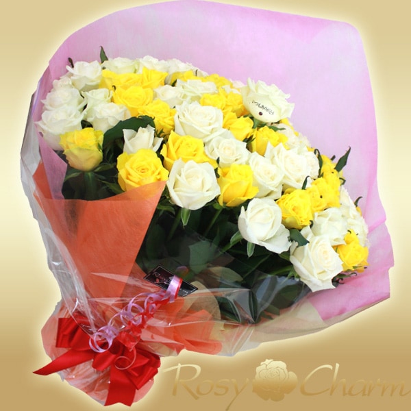 バラの花束 ミックス 黄色と白|メッセージローズ・ブーケミックス|メッセージフラワー対応(本数選択14本~108本)