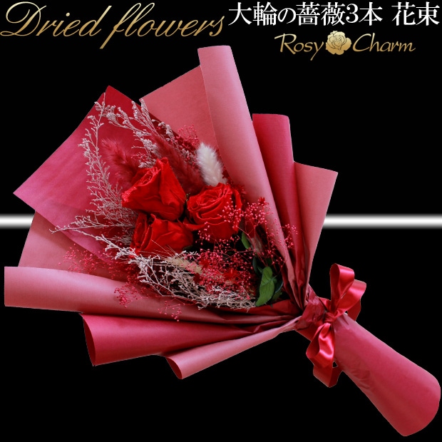 大輪の薔薇3本|ドライフラワーの花束|プロポーズ・記念日・誕生日プレゼントに贈る枯れない花