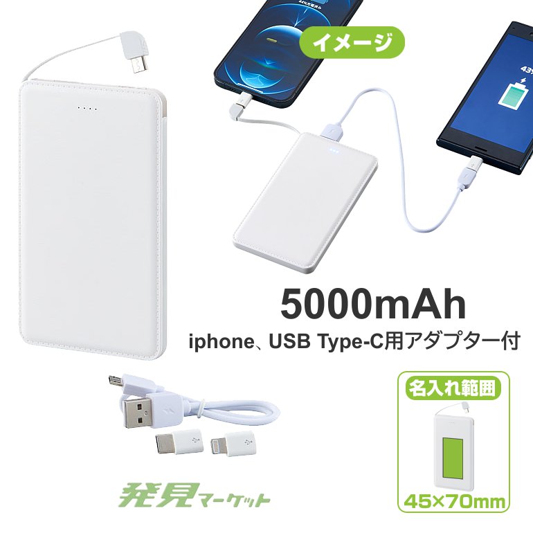 モバイルバッテリー5000mAh(iphone、USB Type-C用アダプター付)