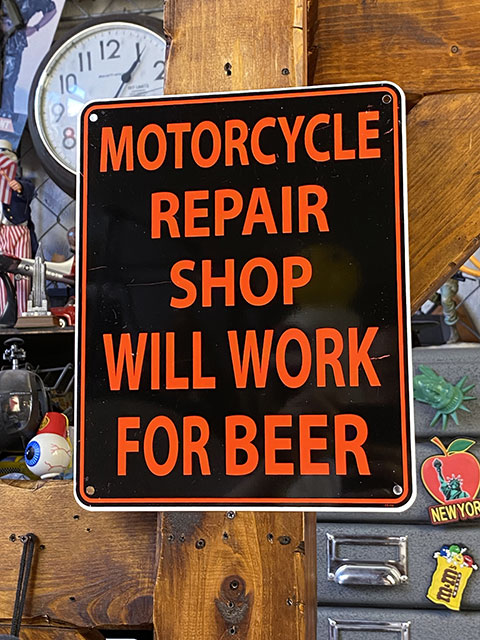 「ビールのためにバイクの修理屋さんやってます」 ミニジョーク看板