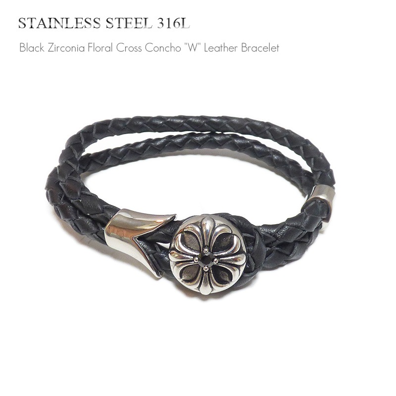 5mm幅編み込みブラックレザー(牛革) 2連仕上げ クロスコンチョ(ステンレス)留め レザーブレスレット 【ステンレス・スチール3...