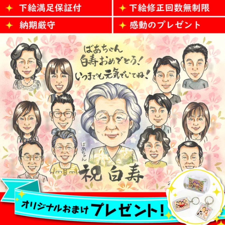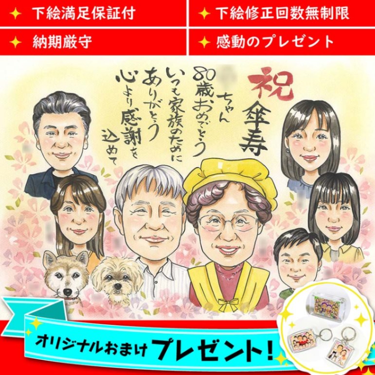 長寿の記念に、家族から贈る愛情が詰まった似顔絵ギフト 故人も思い出せる、家族の笑顔とともに長寿を祝う似顔絵プレゼント