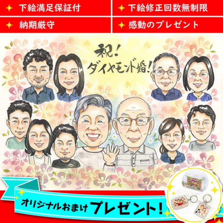 おまけ付き!ダイヤモンド婚を祝う家族の似顔絵 大人数の似顔絵 プレゼント お祝い 還暦 古希 喜寿 傘寿 米寿 卒寿 長寿 結婚記...